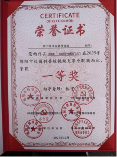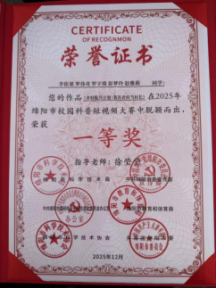 2025年12月11日,绵阳市校园科普短视频大赛颁奖仪式在绵阳市新闻传媒中心涪江观察厅圆满落幕。经过初赛、半决赛、决赛的多轮激烈角逐,我校师生表现亮眼,凭借两部优质科普短视频作品双双斩获一等奖,成为本次大赛的一大亮点。